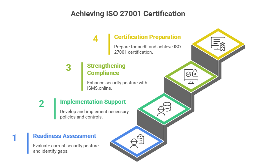 - Certification preparation: support you in becoming audit-ready and achieving your ISO 27001 certification.